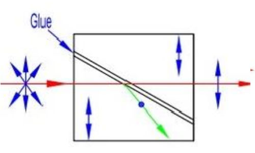 A Glan-Thompson prism is composed of two identical calcite prisms or α-BBO prisms combined together. The extraordinary ray is transmitted, while the ordinary ray is deflected and absorbed.